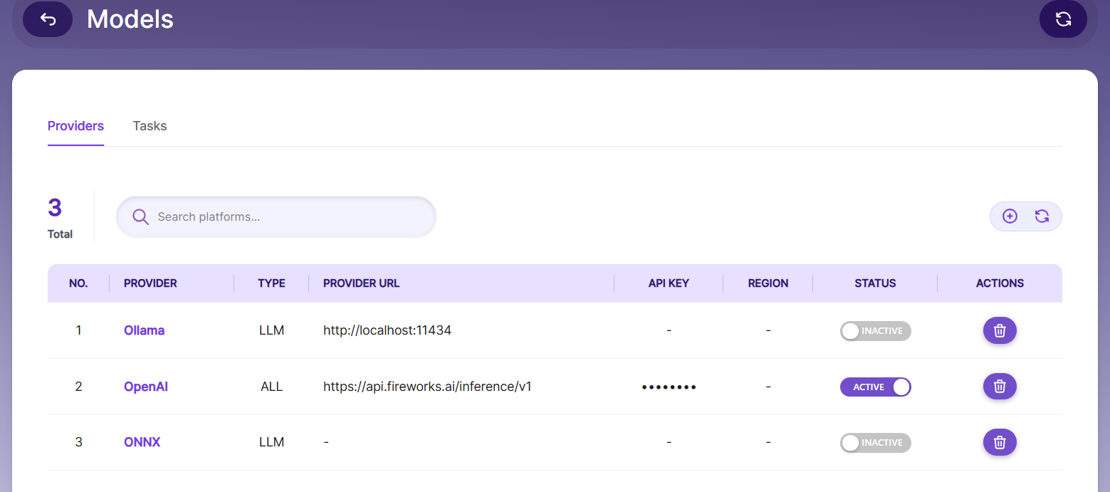 Use the Status toggle switch in the table to enable or disable a provider. Active providers are available for task assignment.