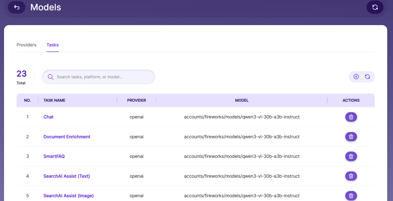 The Tasks tab maps specific SearchBlox features to a provider and model. Each task defines which AI platform and model should be used for a particular function.