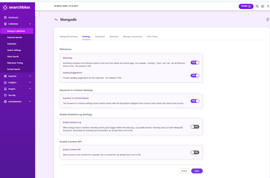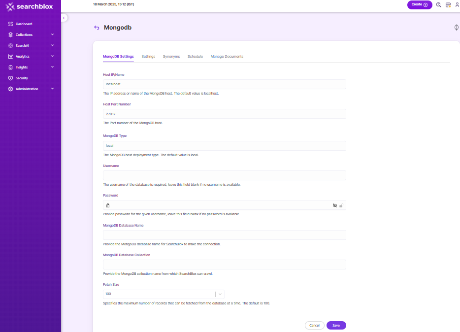 - SearchBlox also comes pre-configured with few parameters when a new MongoDB collection is created which can be modified as required.