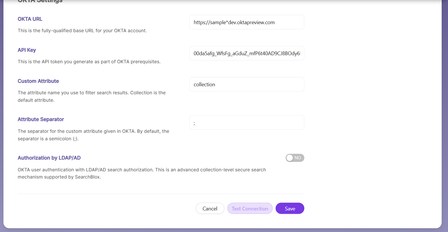 - If you are setting up OKTA for SearchBlox for the first time, please set up your collection attribute mentioned below and then try testing the connection.