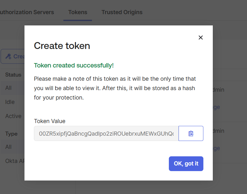 To generate the OKTA API token, go to Tokens under the API section and click Create Token.