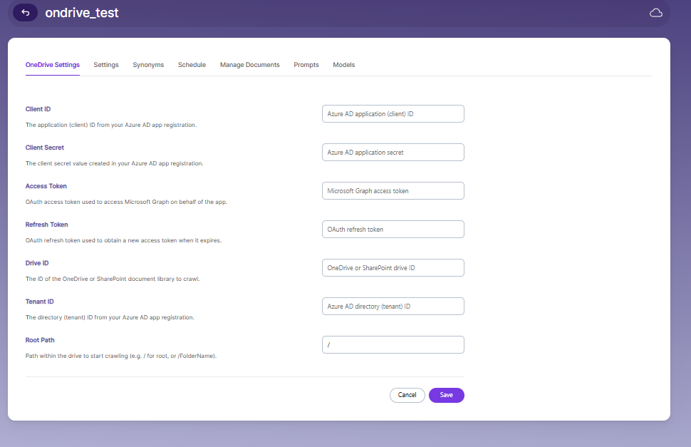 Click Save to store the configuration and enable the system to access and index files from OneDrive or SharePoint.