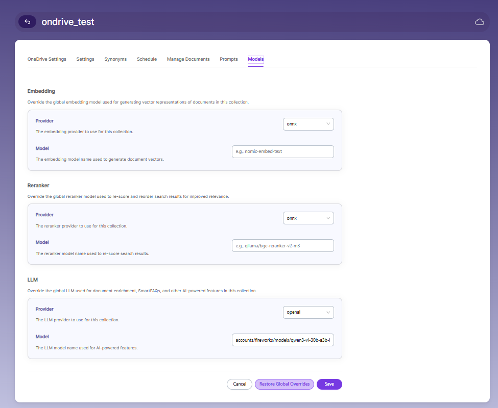 The Models page allows you to configure and override AI models used for embeddings, reranking, and LLM-based features within the collection.