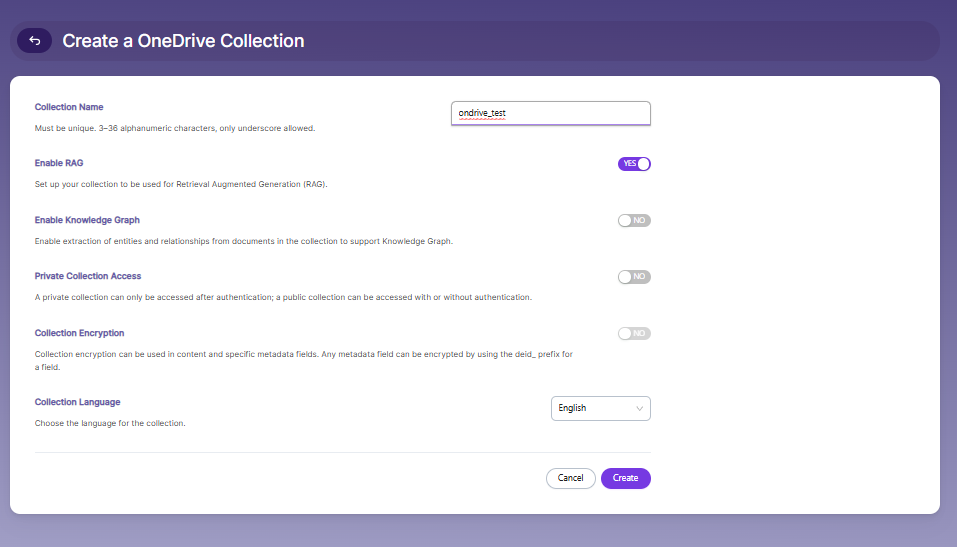 Enable or disable RAG (Retrieval Augmented Generation) depending on your requirement. Enable it if the collection will be used for AI-powered search or chatbot responses.