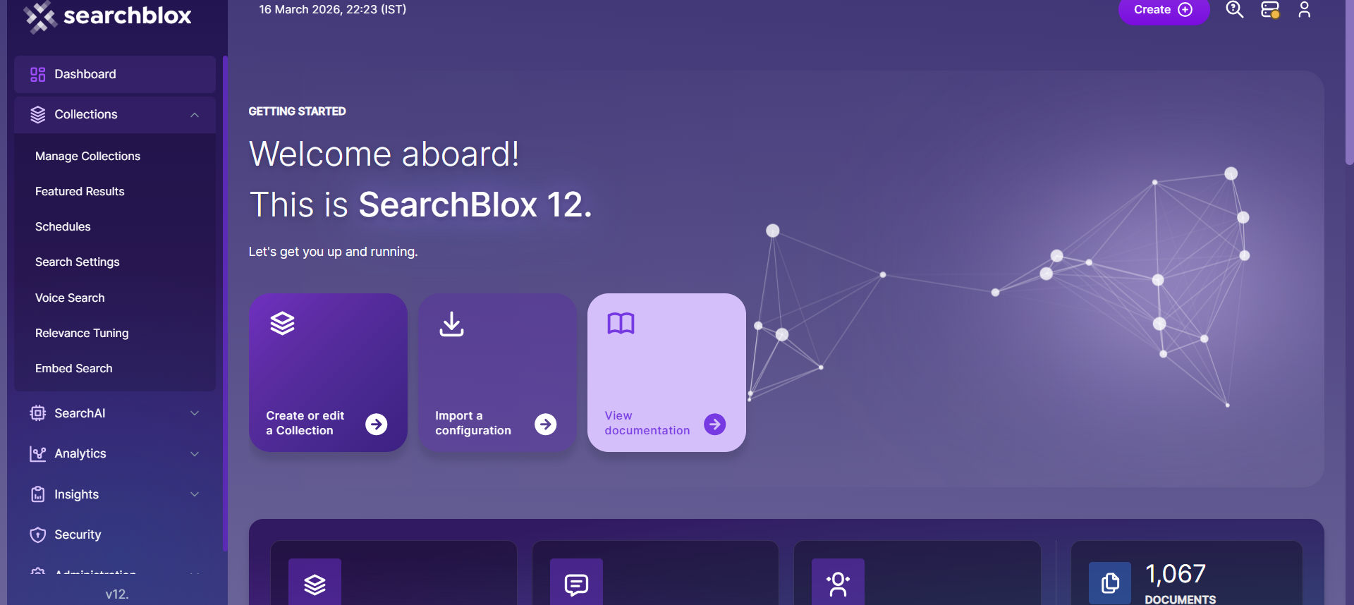 The Dashboard is the central hub of the SearchBlox platform, giving a quick and clear view of how the system is performing. It shows key metrics and activities all in one place, including the number and status of collections and documents, chatbot usage and performance, popular searches, and overall user engagement. This makes it easy to monitor the platform and understand user activity at a glance.