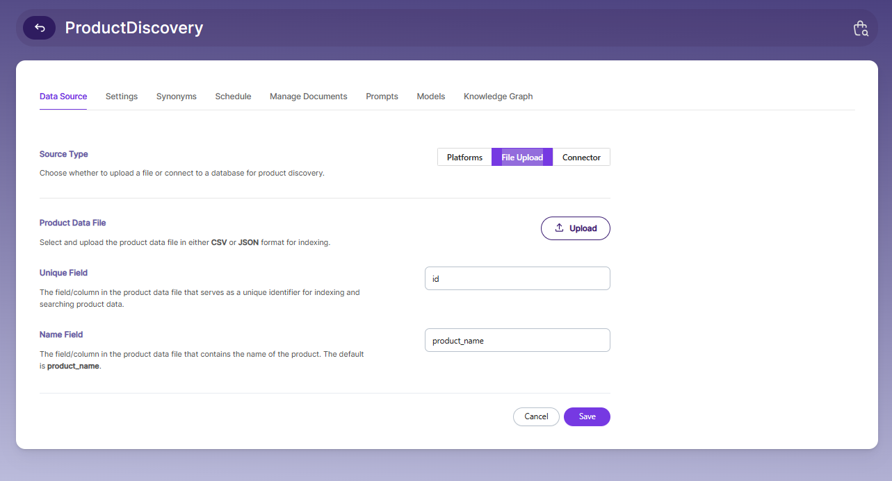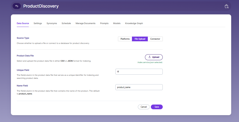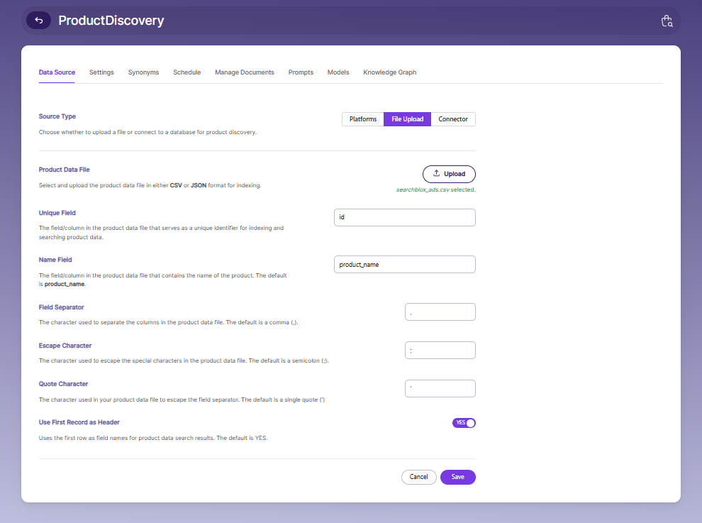 | Unique Field | The CSV column or JSON attribute that has unique values in every record. This helps in indexing and searching. |