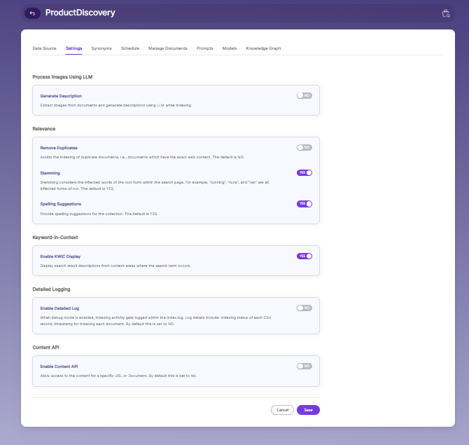| Relevance - Stemming | Matches different word forms of the same root word (e.g., run, running, ran). Default: YES |