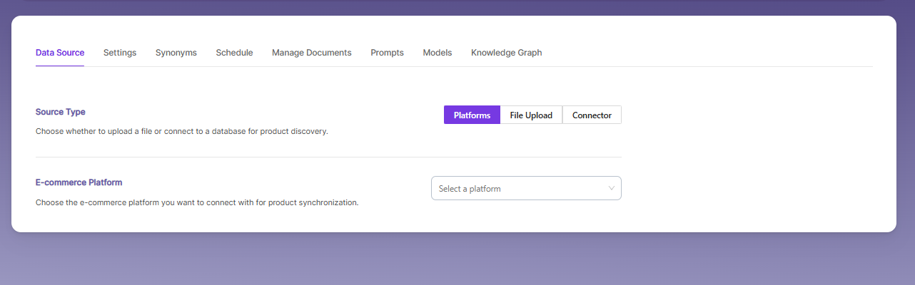 - In the Data Settings tab, you can import test data in three ways: Platforms a ecommerce platform selection Upload a product file or Connect to CDATA Connectors to pull records.