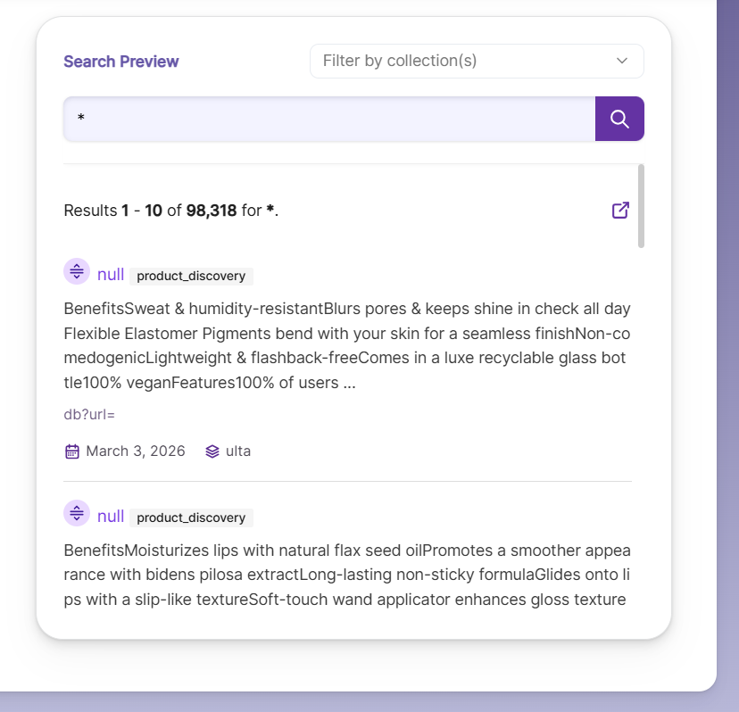 Set boost values for fields such as title, description, or metadata to control their impact on search ranking. - Preview Results: