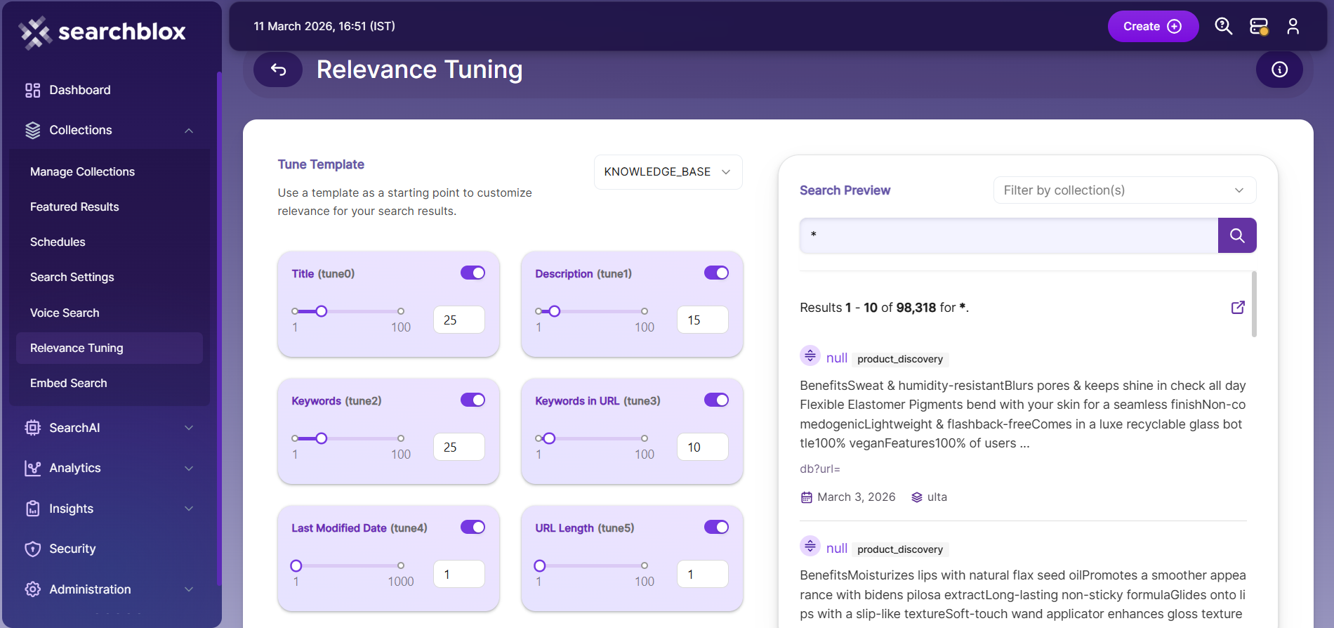 Preview search results after applying tuning to ensure the changes work as expected. - Field Boosting: