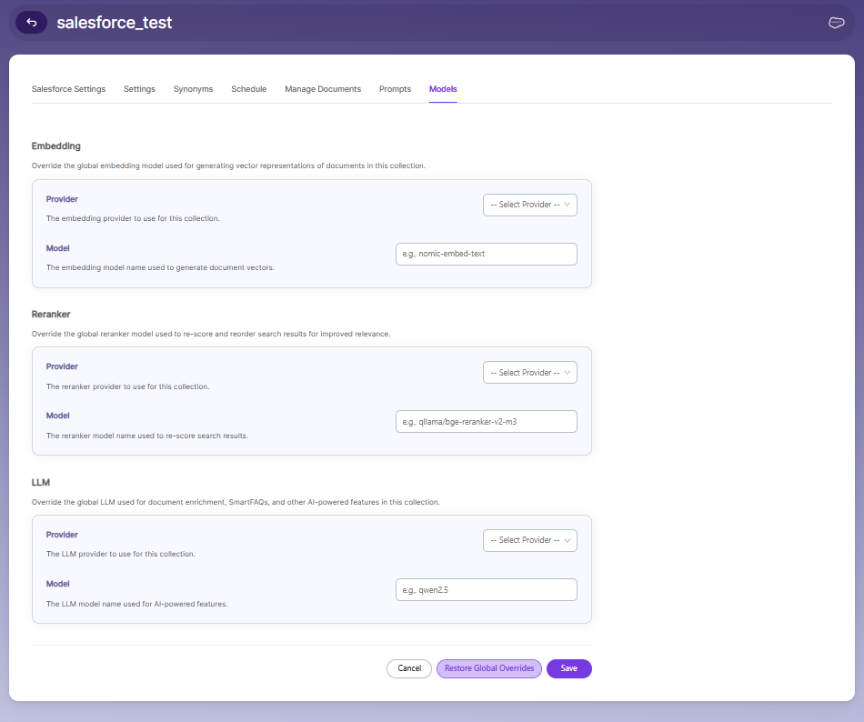 The Models page allows you to configure and override AI models used for embeddings, reranking, and LLM-based features within the collection.