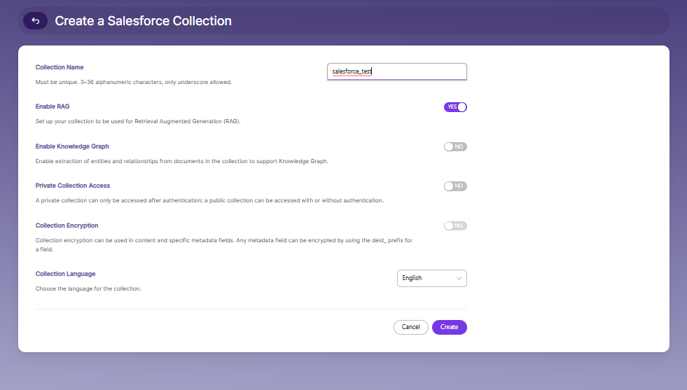Enable or disable RAG (Retrieval Augmented Generation) depending on your requirement. Enable it if the collection will be used for AI-powered search or chatbot responses.