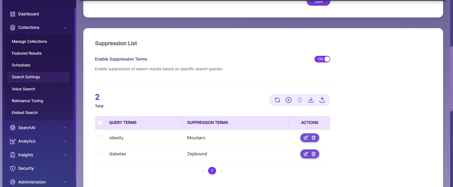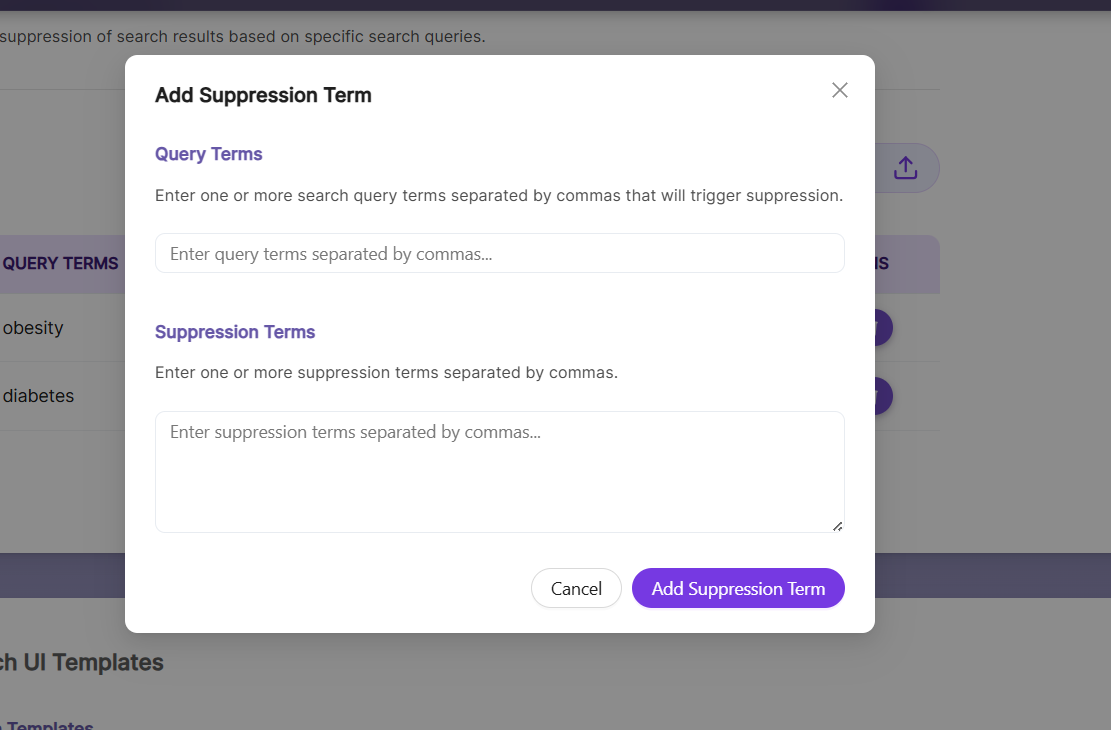 Suppression Terms let you hide or restrict specific results when users search for particular terms. By adding suppression terms, you can control which results appear in the search results.