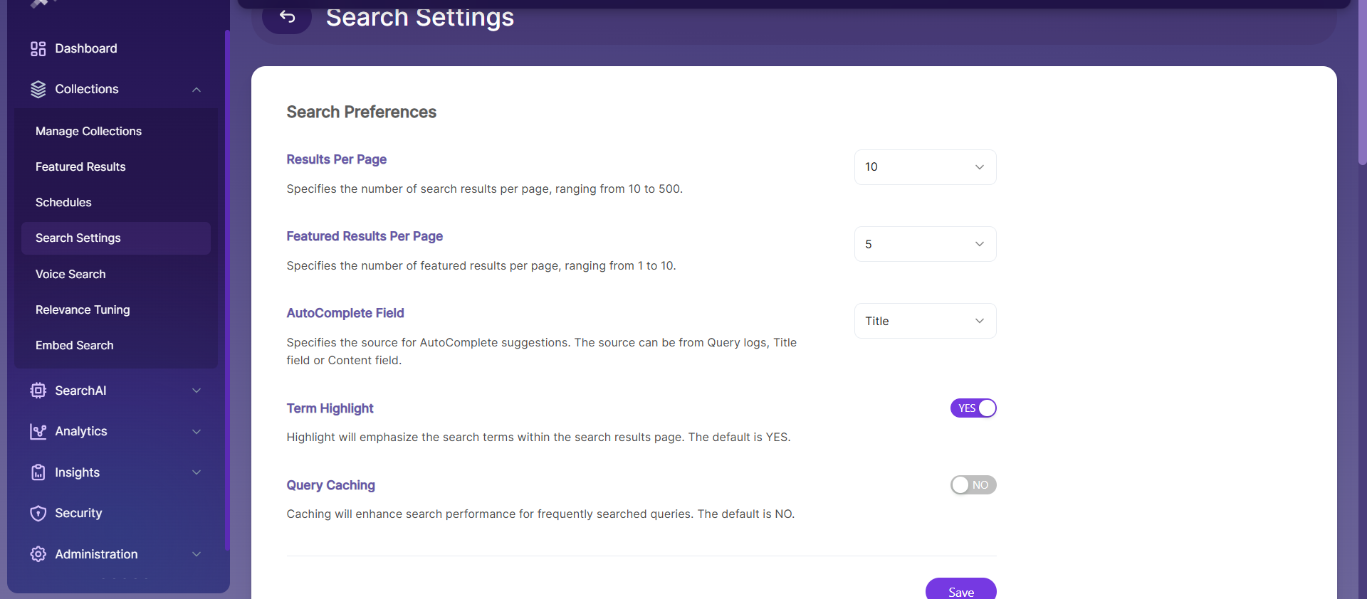 | Query Caching | Improves performance for frequently searched queries. Default is No. |