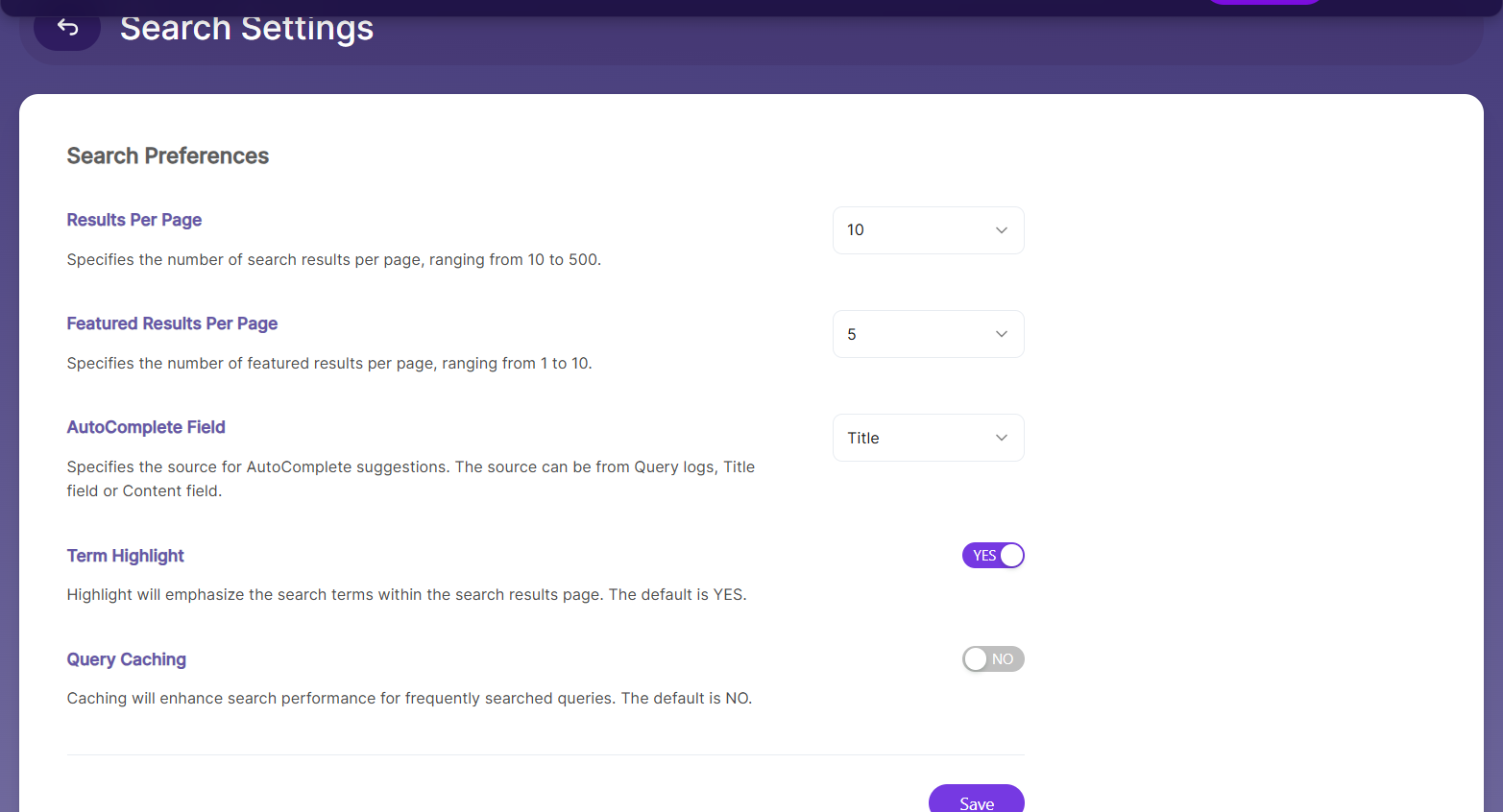 | AutoComplete Field | Source for AutoComplete suggestions: Query logs, Title field, or Content field. Default is Title. |