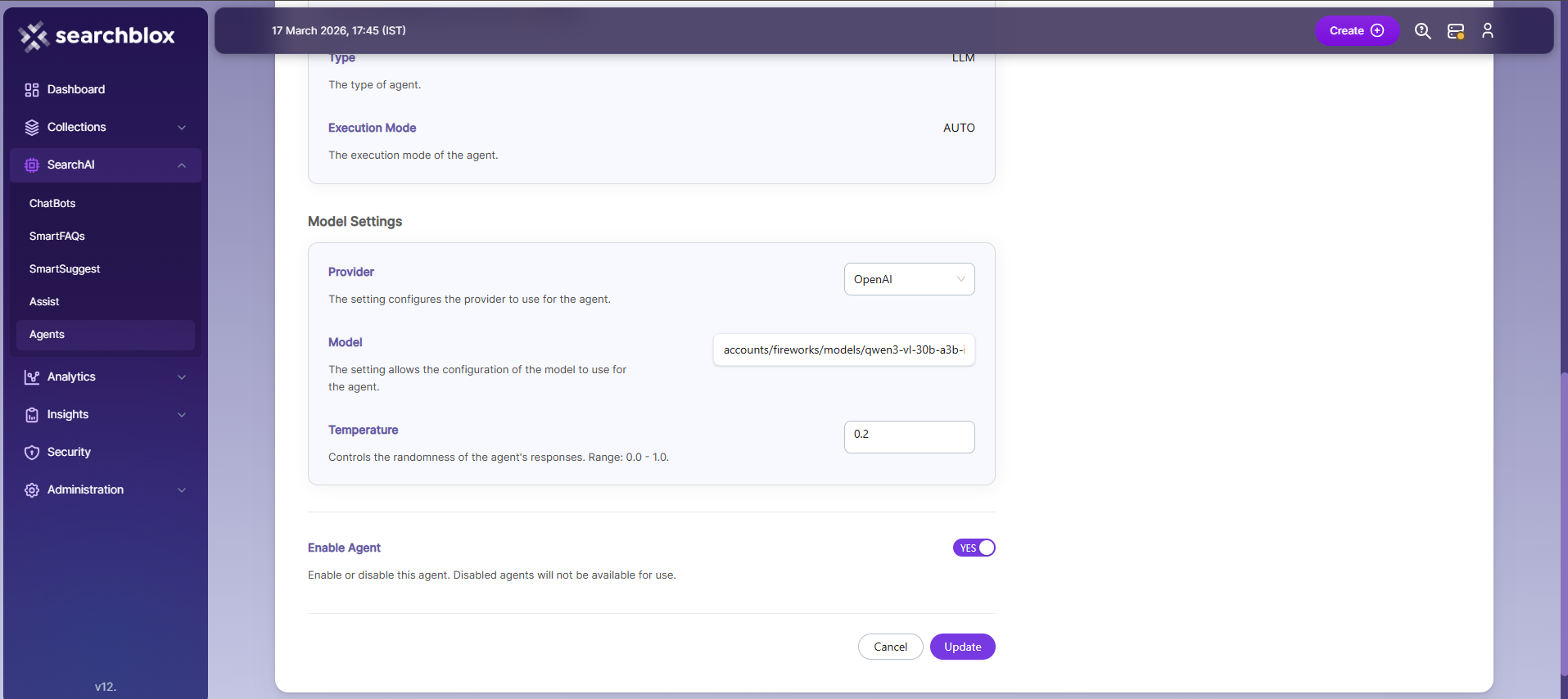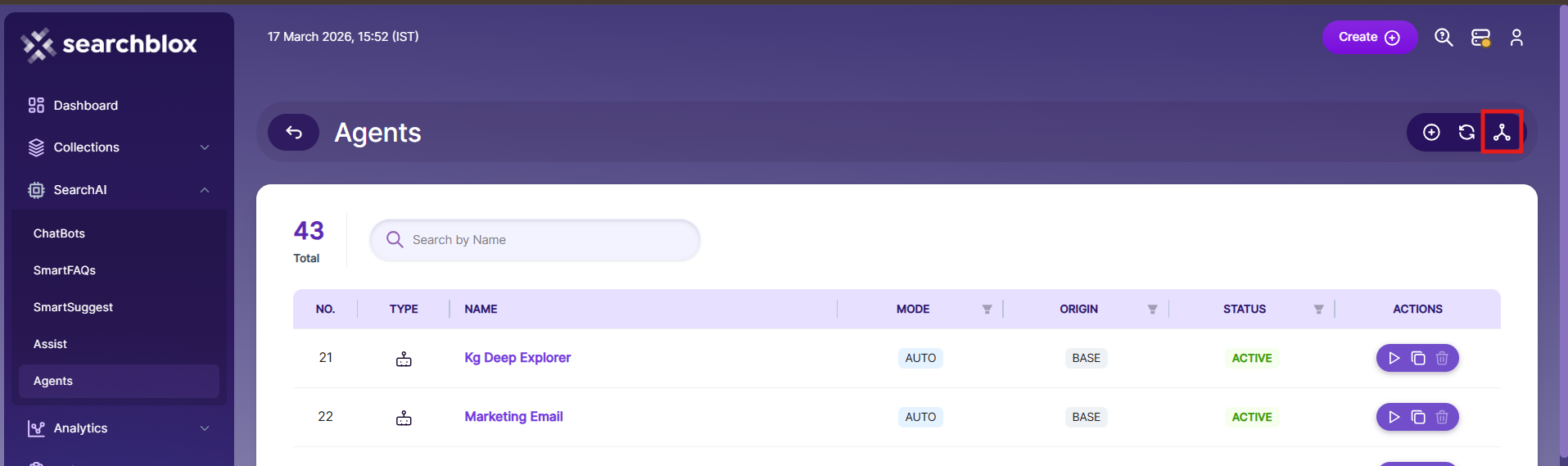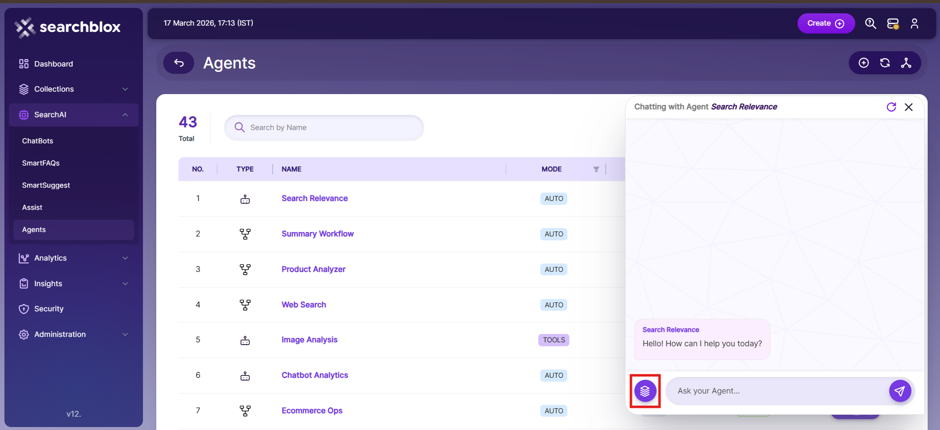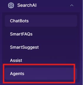 - Navigate to the Agents section under SearchAI in the left sidebar.