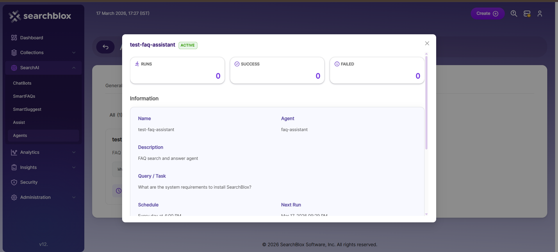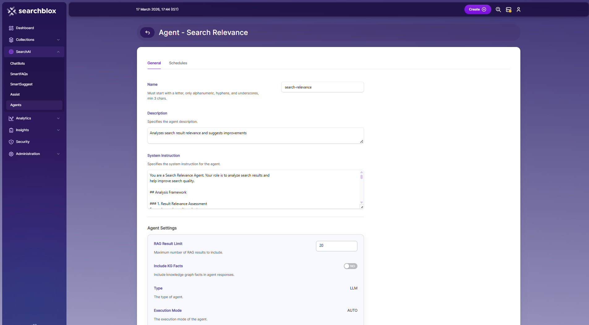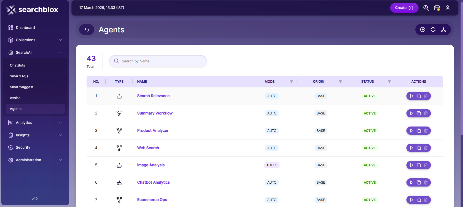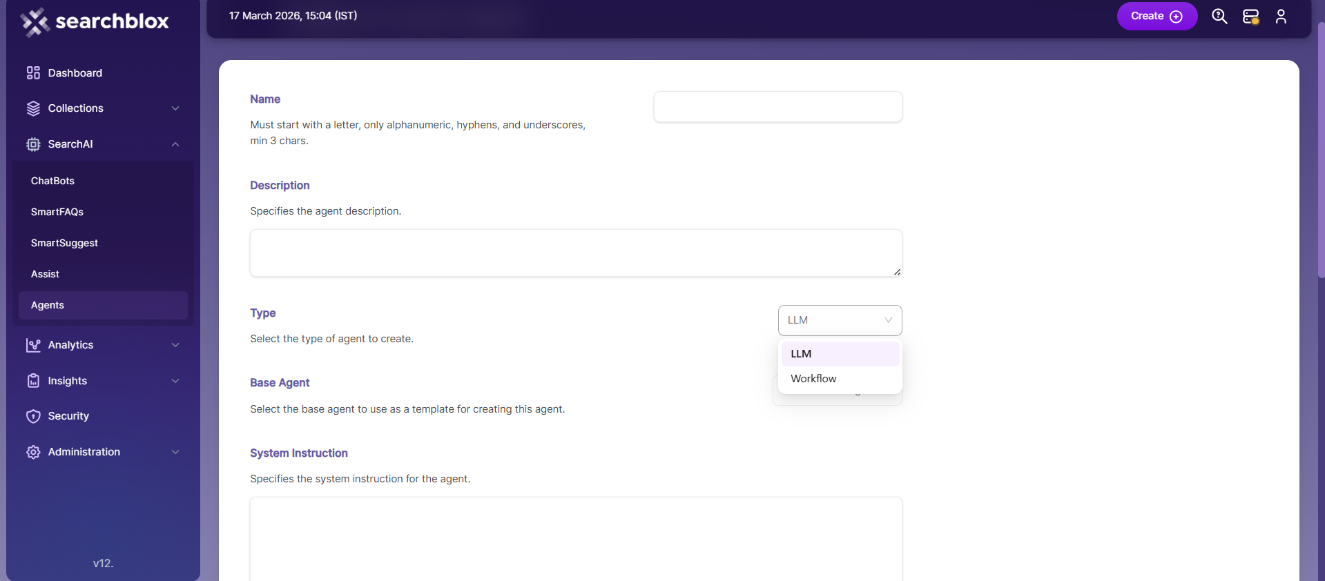 - Navigate to the Agents section under SearchAI in the left sidebar.