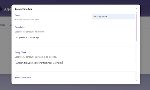 - Select Collections: In Select Collections, choose the collections the agent will use to execute queries or tasks. You can select specific collections or use Select All to include all available collections.