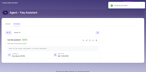 - Schedule details: Name, Agent, Query, Frequency, and Next Run time