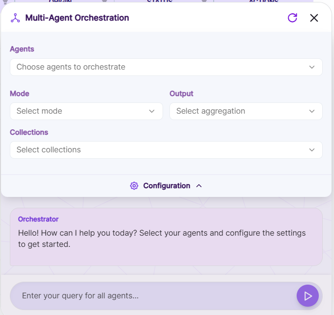 - The Orchestrator panel allows you to enter a query that will be processed by all selected agents. The system coordinates their responses based on the chosen mode and aggregation settings to generate a unified output.