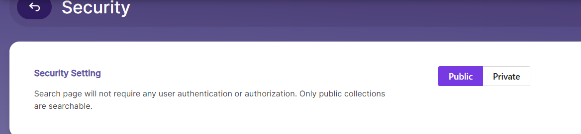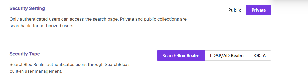 Secure Search can be set up in SearchBlox under the Security tab in the Admin Search menu. There are two types of secure search settings: Public and Private.