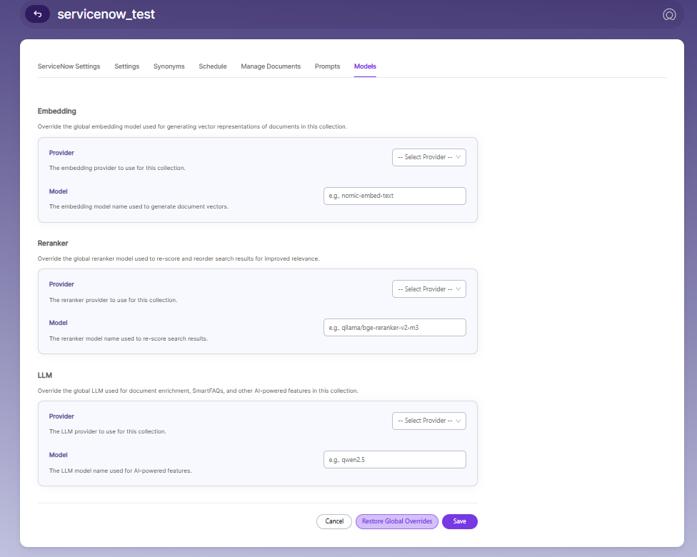 The Models page allows you to configure and override AI models used for embeddings, reranking, and LLM-based features within the collection.