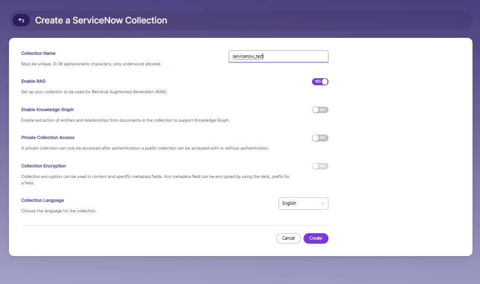Enable or disable RAG (Retrieval Augmented Generation) depending on your requirement. Enable it if the collection will be used for AI-powered search or chatbot responses.