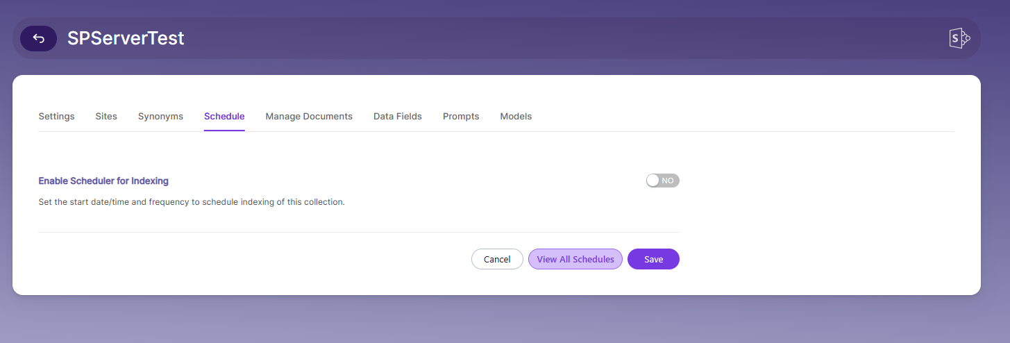 | Enable Scheduler for Indexing | Once enabled, you can set the Start Date and Frequency |