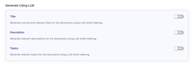| Topic | Generates relevant topics for indexed documents using LLM based on document's content. |