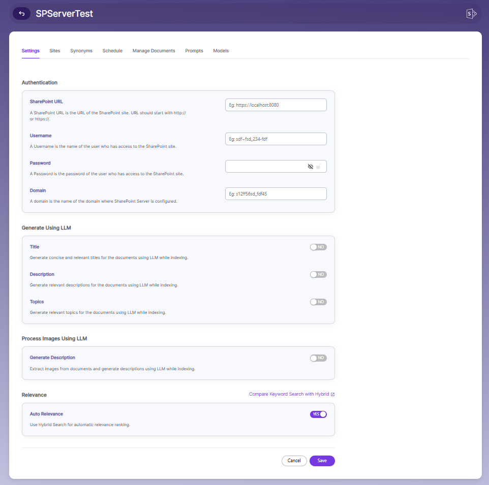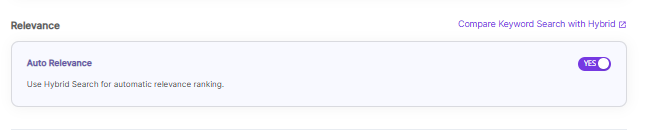| Auto Relevance | Enable/Disable Hybrid Search for automatic relevance ranking |