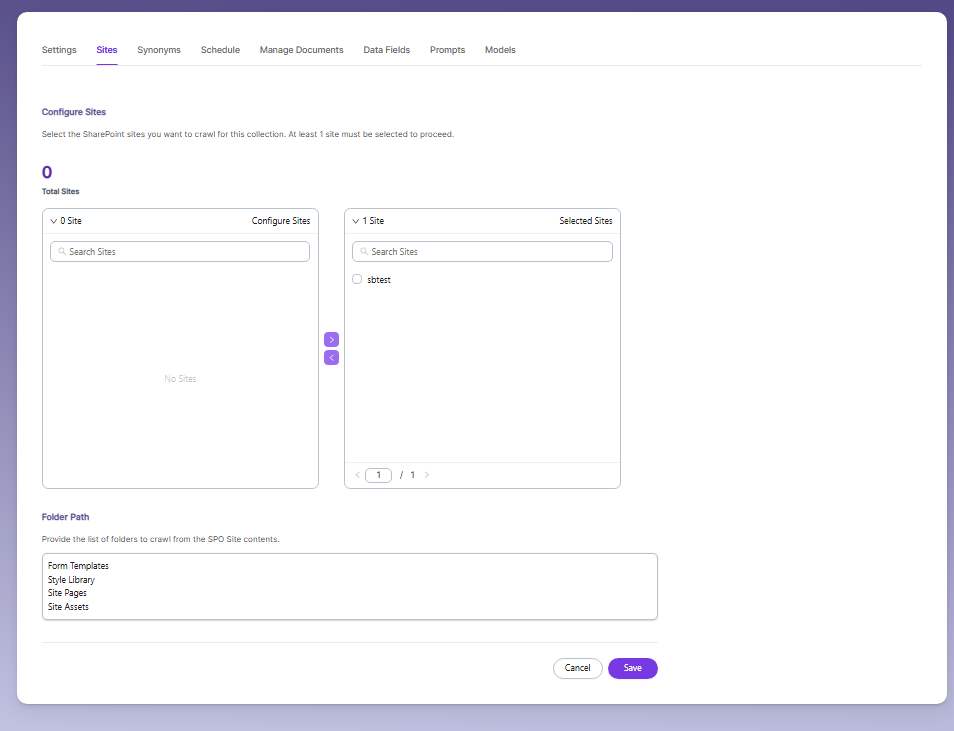 - Select the Sites to be indexed (ensure the user has access).