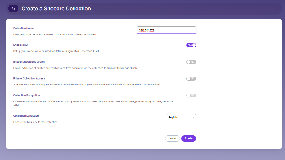 Enable or disable RAG (Retrieval Augmented Generation) depending on your requirement. Enable it if the collection will be used for AI-powered search or chatbot responses.