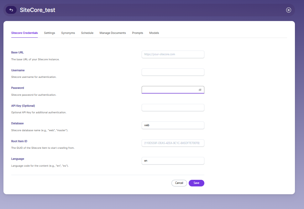 This is the URL of your Sitecore instance (e.g.,https://your-sitecore.com) used to connect and retrieve content. -