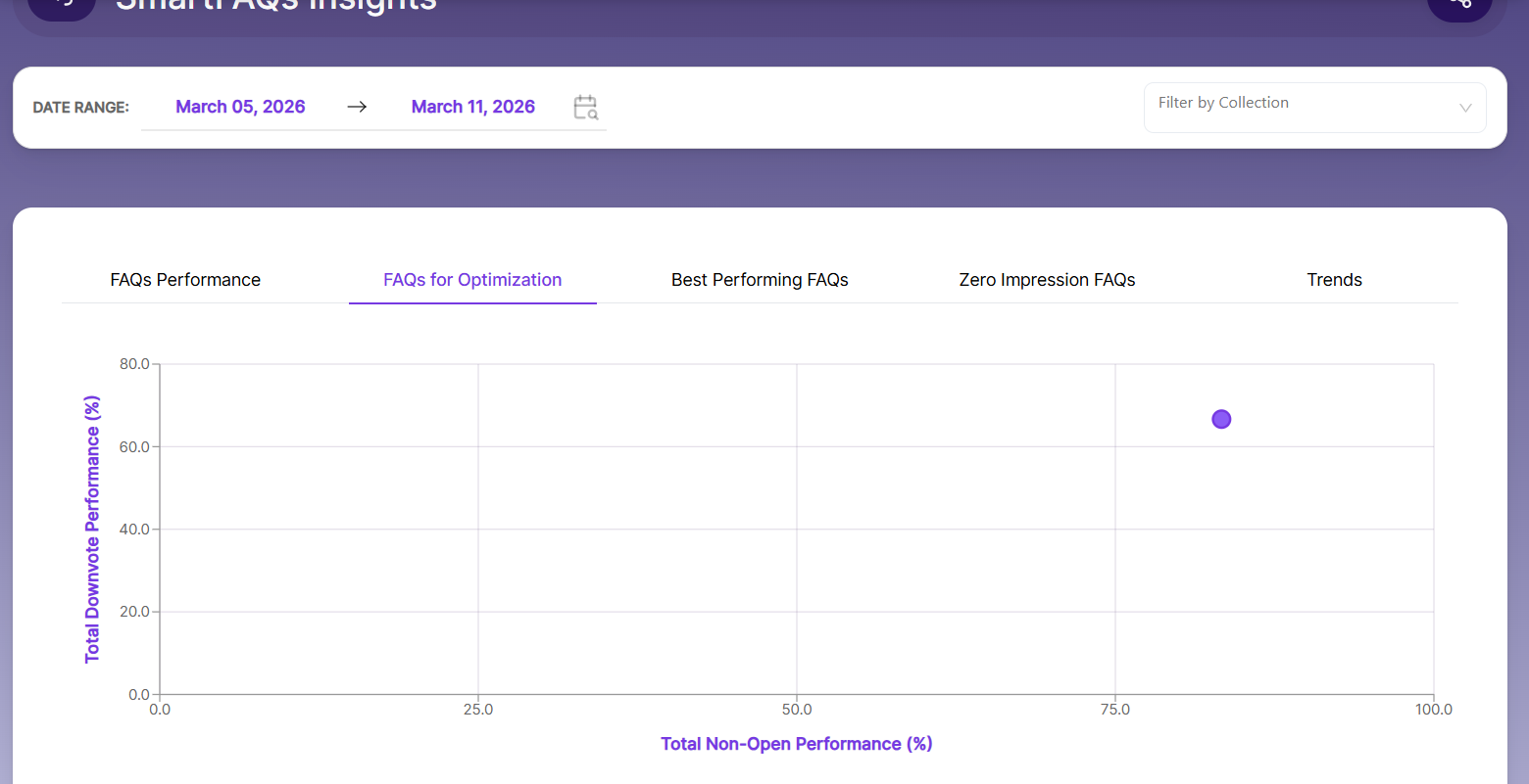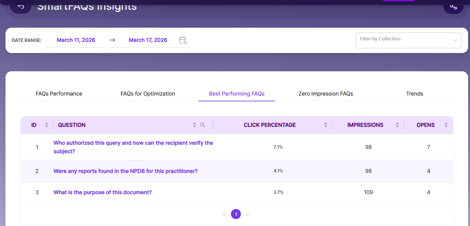 Top Performing FAQs – Shows the mean percentage of positive user interactions, including opens, clicks, and upvotes.