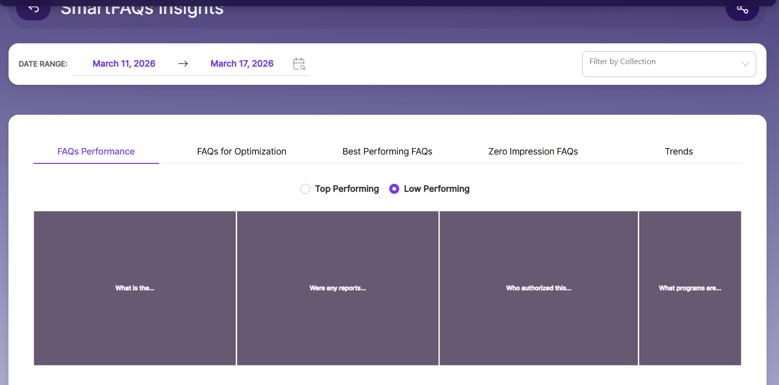 Best Performing FAQs - Mean percentage of opens, clicks, and impressions. As shown in the reference, SmartFAQs can be updated or prioritized using the Top Performance, Low Performance, or FAQs for Optimization tabs.