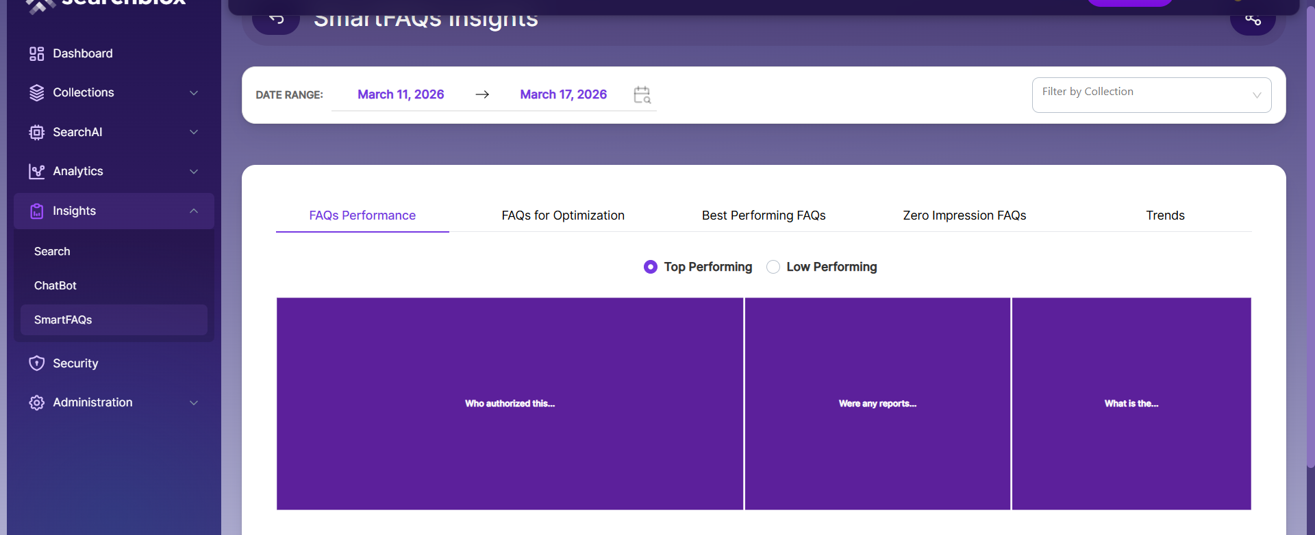 Trends - Displays a SmartFAQs trend graph filtered by the selected date range. Users can also select Top Performed SmartFAQs from the dropdown menu, as shown in the reference.