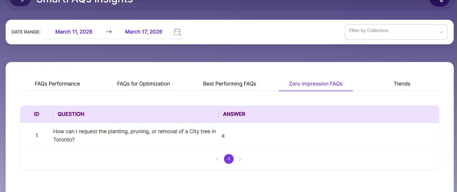 Zero Impression FAQs -Shows the SmartFAQs that never appear on the search page.