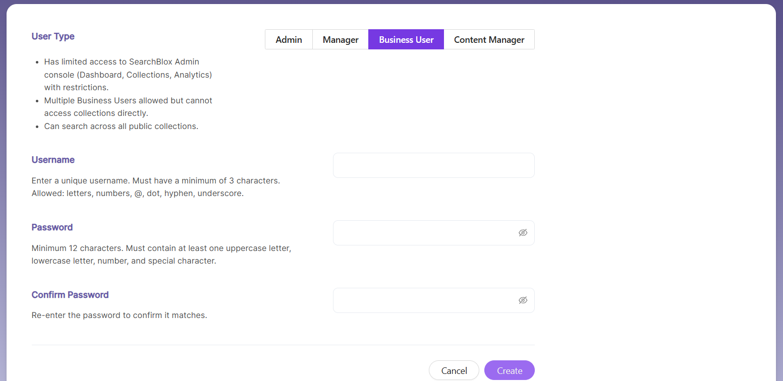 Multiple Users Allowed: A SearchBlox instance can have any number of Business Users.