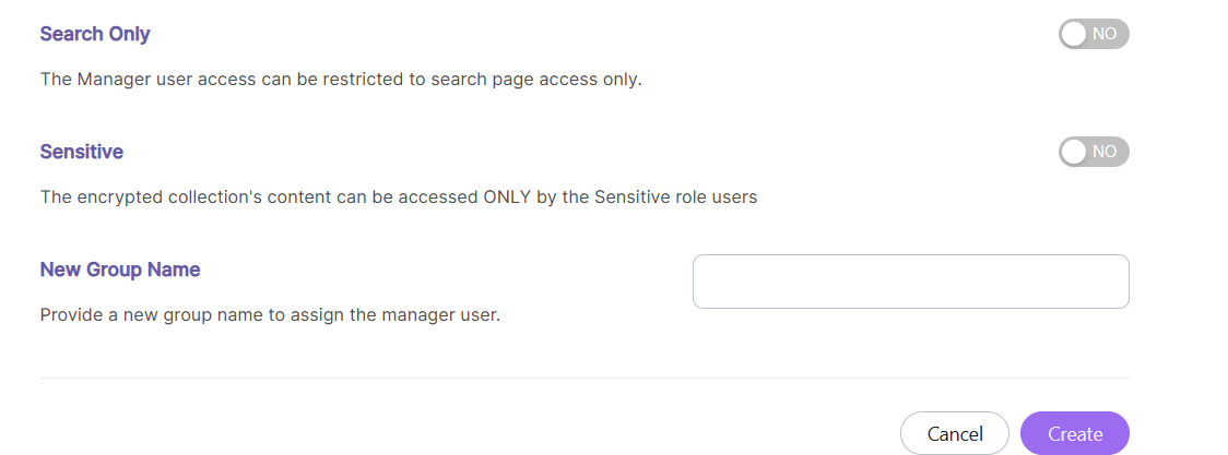 | SearchBlox Realm - Manager Role Search Only Access | - No access to the SearchBlox Admin Console. - Can access only the search results for their assigned Manager groups, including Public and Private collections within those groups, along with all Public collections created by other users. -Encrypted collection content is accessible only to users with the Sensitive role. |