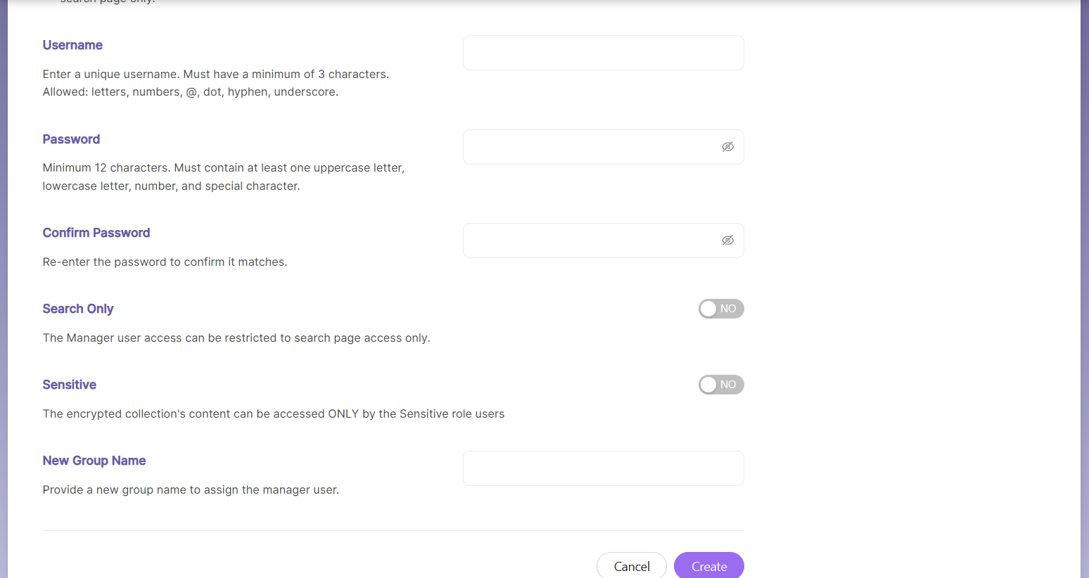 Sensitive Content Access (Version 10.0+): From version 10.0 onward, content and meta fields can be encrypted. Managers can view this encrypted content only if the “sensitive option” is enabled for them in User Management.