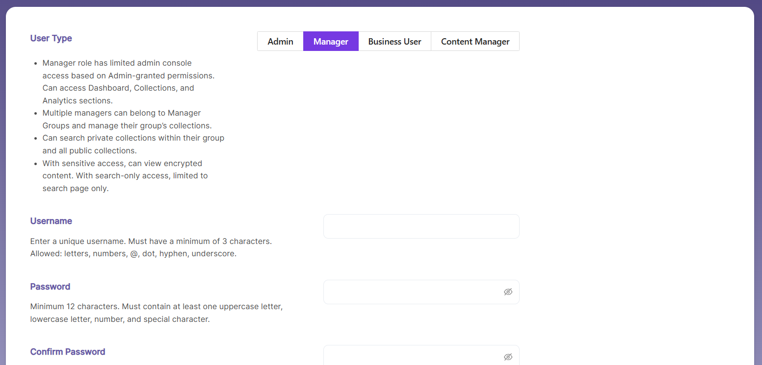 - A user group must be created during Manager creation, and the same group(s) can later be assigned to additional Managers.