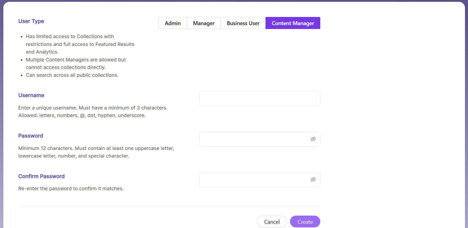 No User Management Access: Content Managers cannot access the User Management tab and cannot create or manage other users.