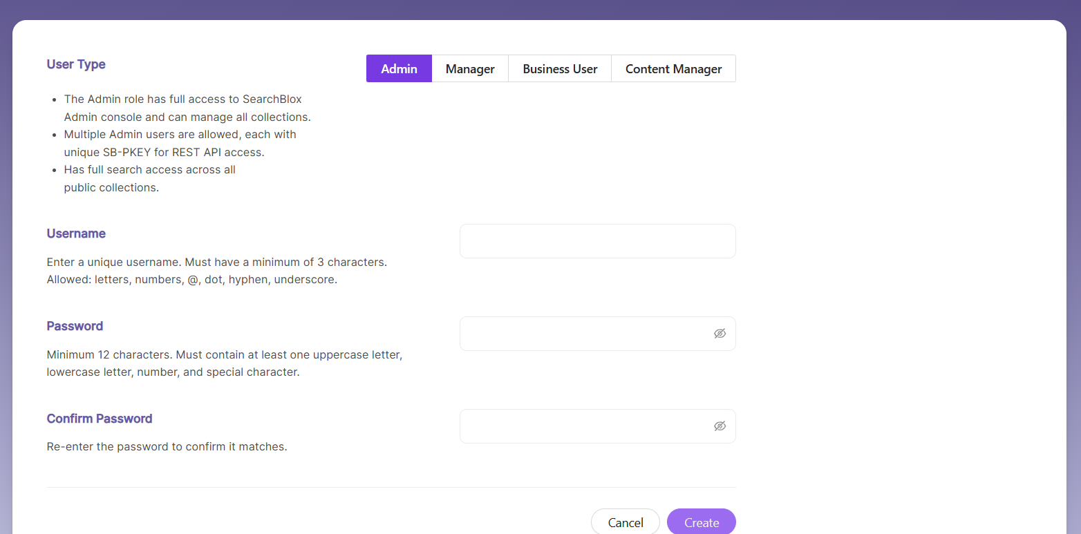 Multiple Admins: A SearchBlox instance can have multiple Admin users, unlike the single Super Admin limitation.