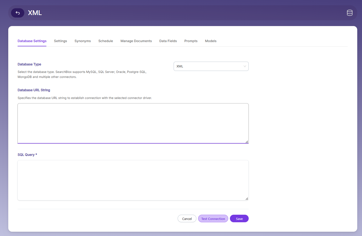 Purpose: This allows the system to properly read, process, and index XML data - Select XML as the database type from the dropdown menu.